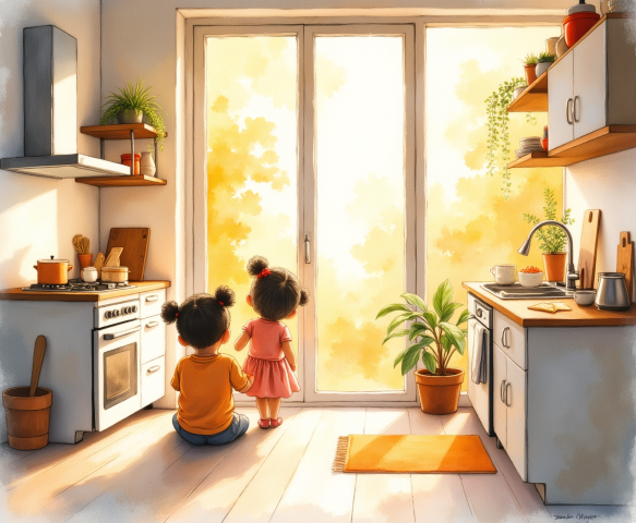 sisters in kitchen looking out