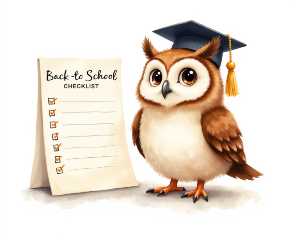 Free clipart illustration of a wise owl standing beside a back to school checklist (13)
