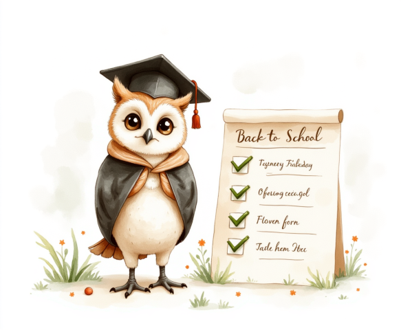 Free clipart illustration of a wise owl standing beside a back to school checklist (5) →