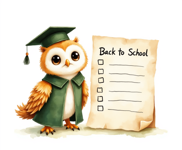 Free clipart illustration of a wise owl standing beside a back to school checklist (7)