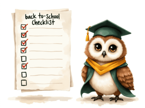 Free clipart illustration of a wise owl standing beside a back to school checklist (11)