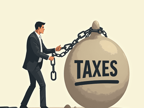 free clipart illustration of a businessman chained to a ball labelled taxes (2)