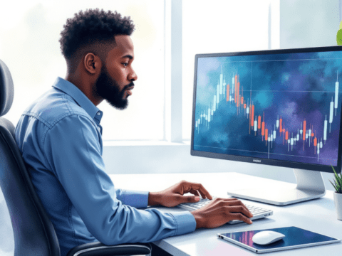 Free clipart illustration of a black stock market analyst viewing trade trend on computer (7)