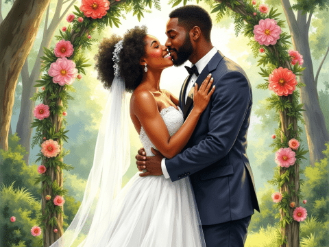 Free clipart illustration of black bride and groom kissing at their wedding (5)