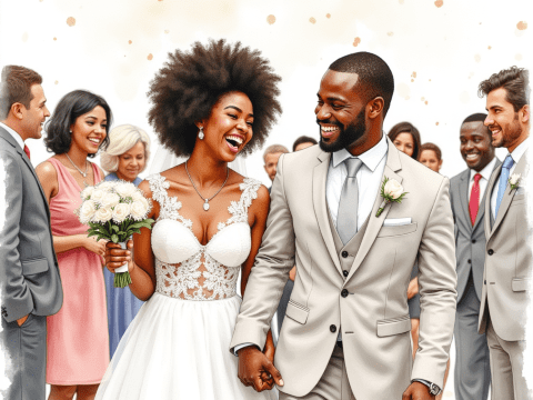 Free clipart illustration of black couple exiting wedding as attendees cheer (8)