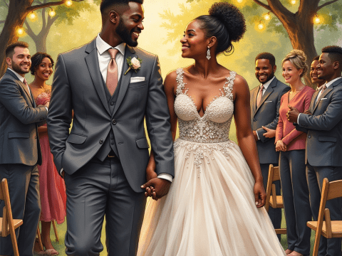 Free clipart illustration of black couple exiting wedding as attendees cheer (4)