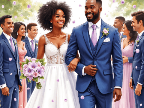 Free clipart illustration of black couple exiting wedding as attendees cheer (3)