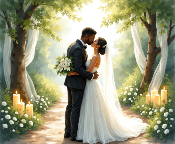 Free clipart illustration of bride and groom kissing with forest in background (8)