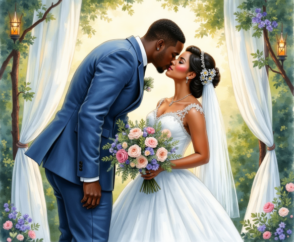 Free clipart illustration of black bride and groom kissing at their wedding (5)
