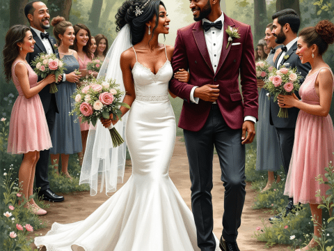 Free clipart illustration of black couple exiting wedding as attendees cheer (6)