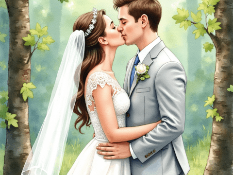 Free clipart illustration of bride and groom kissing with forest in background (5)