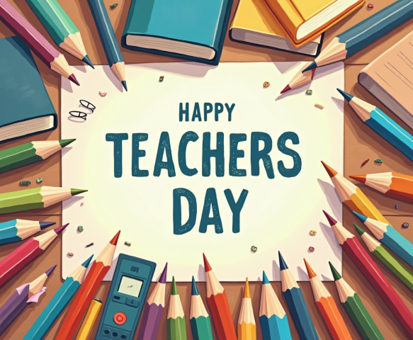 free clipart illustration of a happy teachers day text with stationery items background (1)