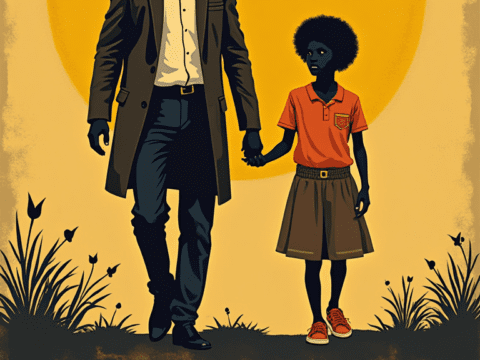 father son walking sunset