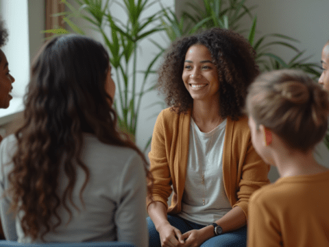 smiling friends working laptop cafe