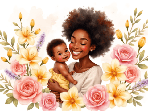 Free clipart illustration of black mother and son holding mothers day gift box (3)
