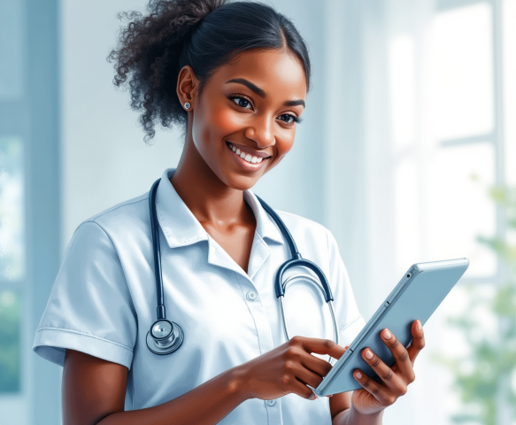 free clipart illustration of a nurse looking at medical report on her tablet (2)