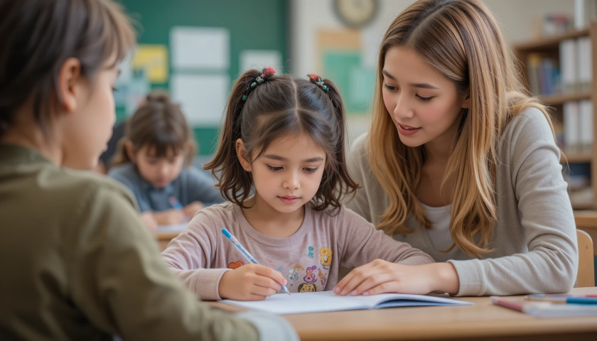 free clipart illustration of teacher helping students in a classroom (3)