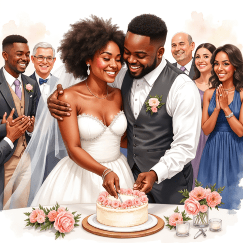 Free clipart illustration of a black bride and groom cutting wedding cake