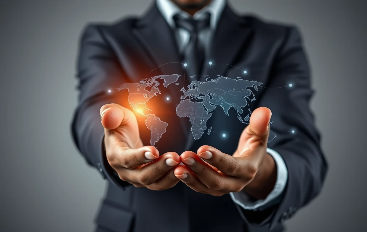 businessman holding digital world map