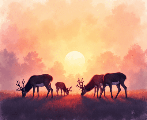 sunset reindeers grazing