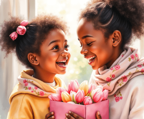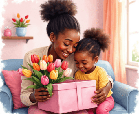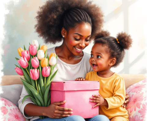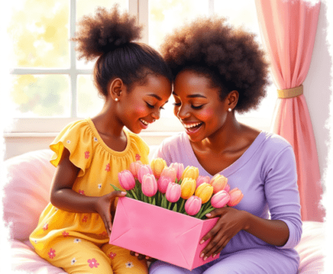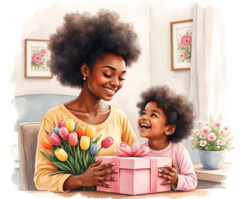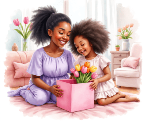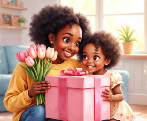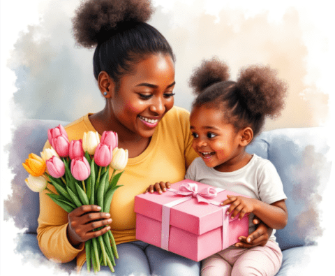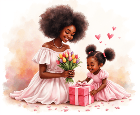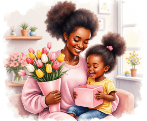 Free clipart illustration of a black Jamaican mother getting mothers day gift from daughter (1)