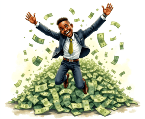 free clipart illustration of a black businessman jumping on a pile of money – Copy