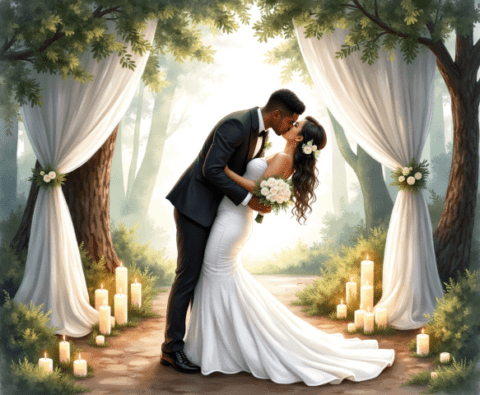Free clipart illustration of bride and groom kissing with forest in background (10)