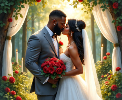 wedding couple kissing roses