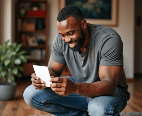 free stock photo of black father looking at greeting card