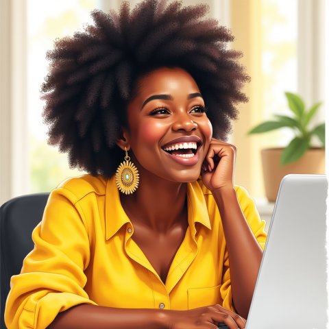 smiling woman yellow shirt working laptop