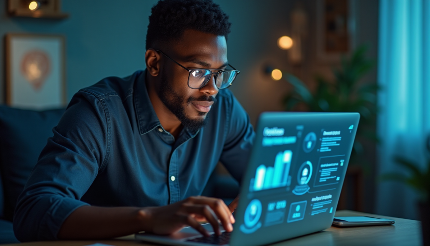 young man working laptop smartphone